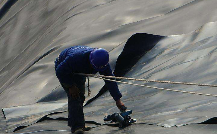 底部土工膜應(yīng)盡快與邊坡上土工膜連接上,防止下雨時,雨水倒灌進(jìn)入土工膜焊接成品的下面。底部土工膜的鋪焊是在邊坡土工膜鋪焊完成之后進(jìn)行的。按裁好的土工膜尺寸,一幅一幅鋪設(shè),做好記錄。在鋪設(shè)土工膜時,應(yīng)邊鋪邊焊,當(dāng)天鋪設(shè)當(dāng)天焊完。