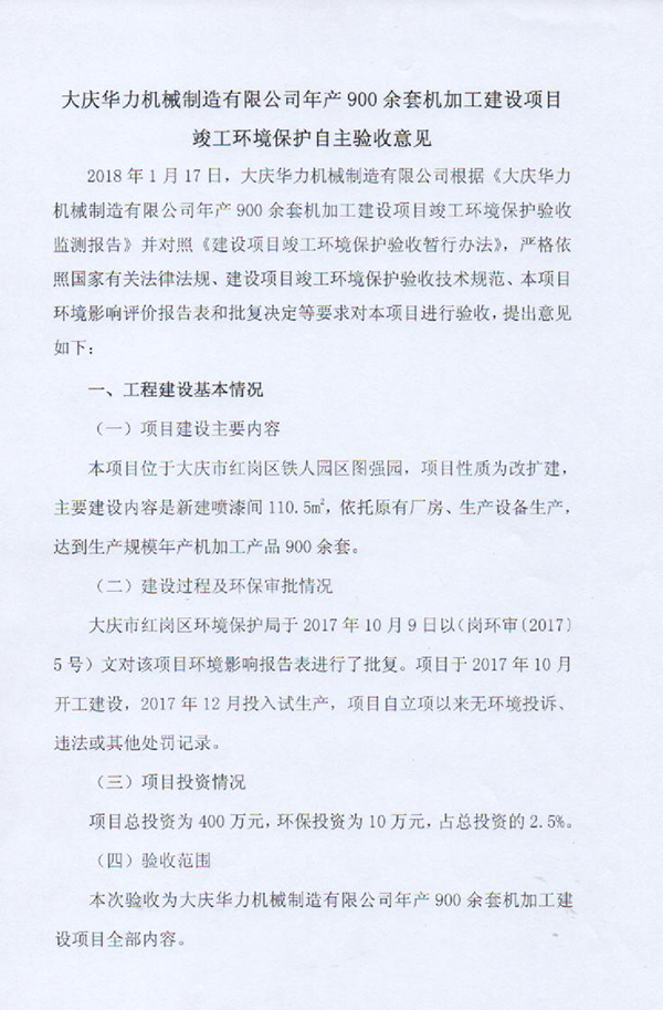 大慶華力機(jī)械制造有限公司年產(chǎn)900余套機(jī)加工建設(shè)項(xiàng)目自主驗(yàn)收公示